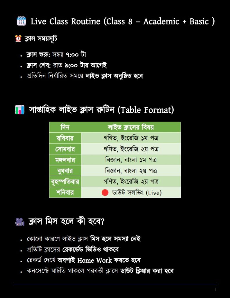 📅 Live Class Routine (Class 8 – Academic + Basic)